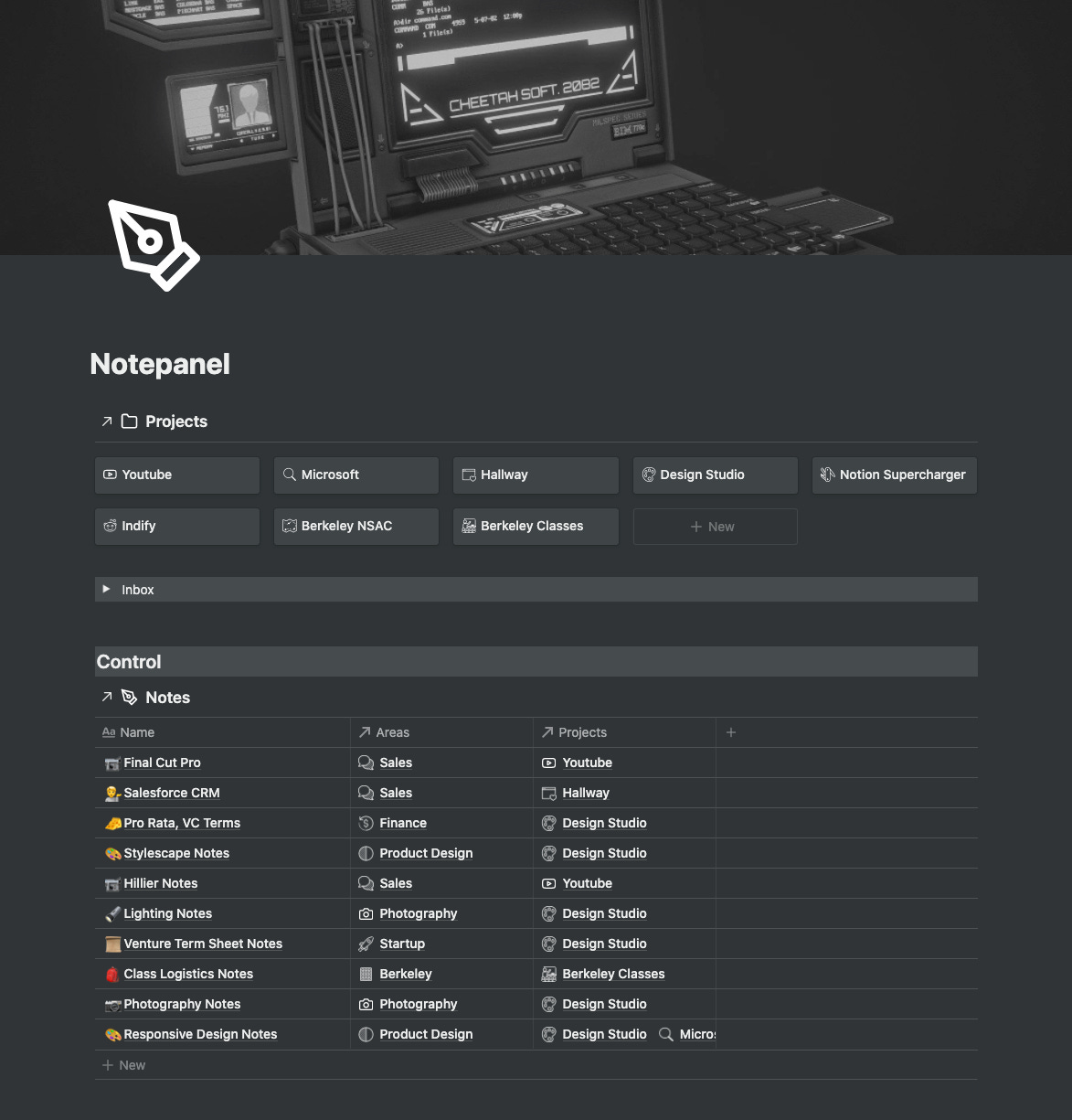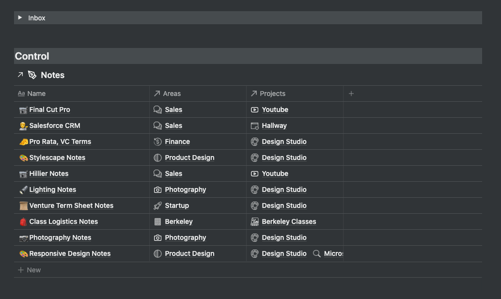 Control is just a linked database view of all notes that have been tagged with properties. Inbox is a toggle, which, when toggled on, shows a linked database view of notes that have incomplete tagging.